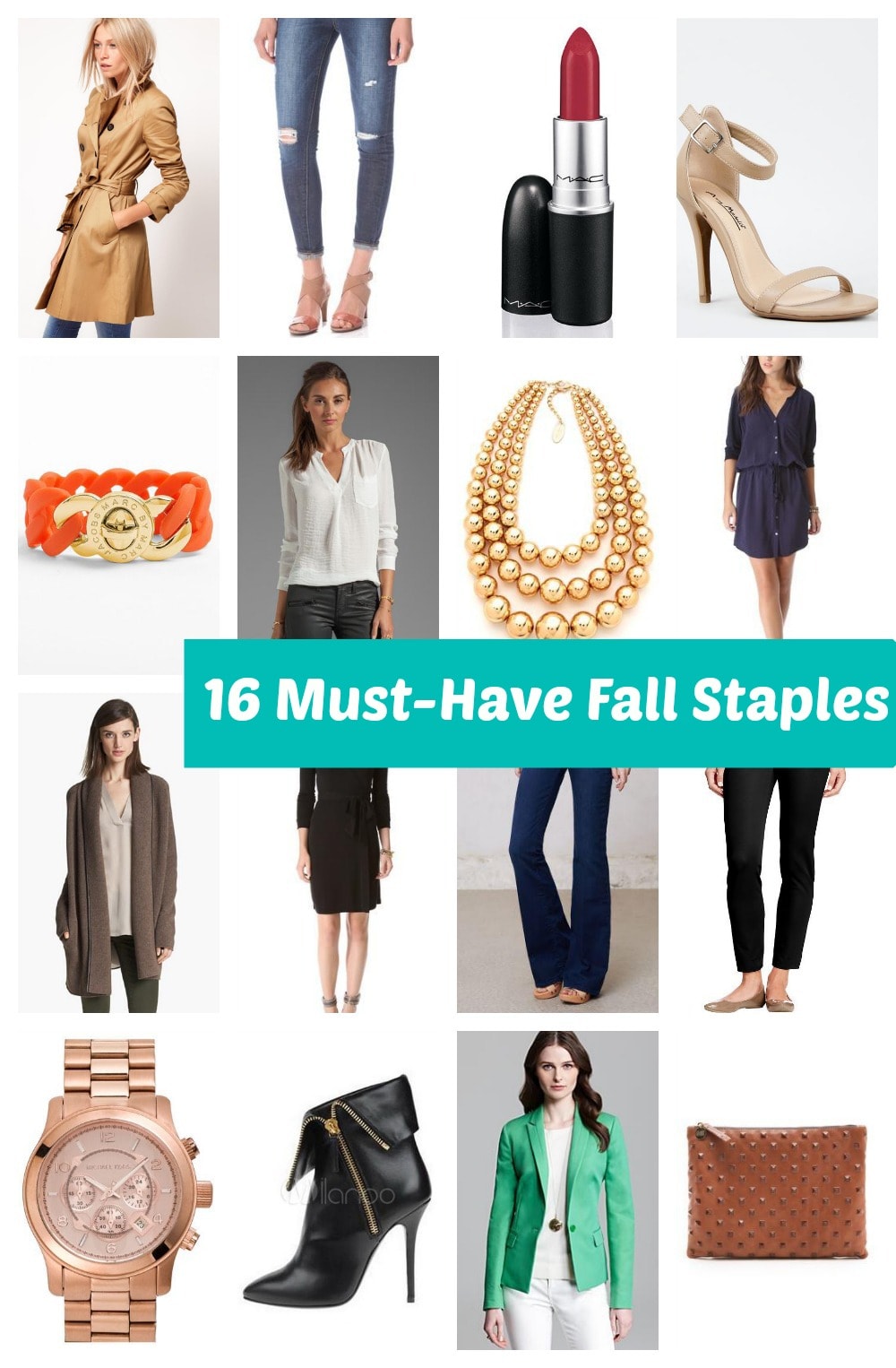 1. Classic Trench // 2. Skinny Jeans // 3. Rich Red Lipstick // 4. Nude Heel // 5. Collection of Bangles // 6. White Shirt (I’m bored of the button down) // 7. Statement Necklace // 8. Shirt Dress // 9. Over-sized Comfy Blanket Sweater // 10. Black Dress // 11. Wide Leg Jeans // 12. Black Ankle Pants // 13. Over-sized watch // 14. Booties // 15. Colored Blazer // 16. Clutch