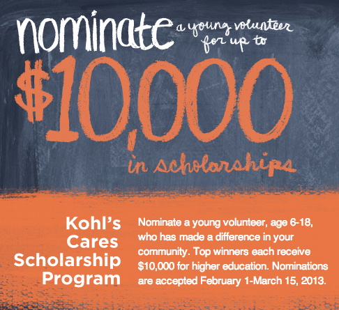 Kohl’s Department Stores will be accepting nominations for outstanding young volunteers beginning next week for the 2013 Kohl’s Cares Scholarship Program. I wanted to write about this because I thought it was a wonderful program and an easy way to show the volunteers in your life that you are noticing the good they are doing for their community.