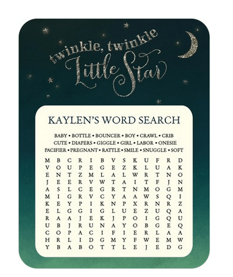 3. Personalized Word Search : How fun is this?! You can customize a word search with either the mom’s name or the baby’s name (if it’s been announced) and have the guests race to the finish line.