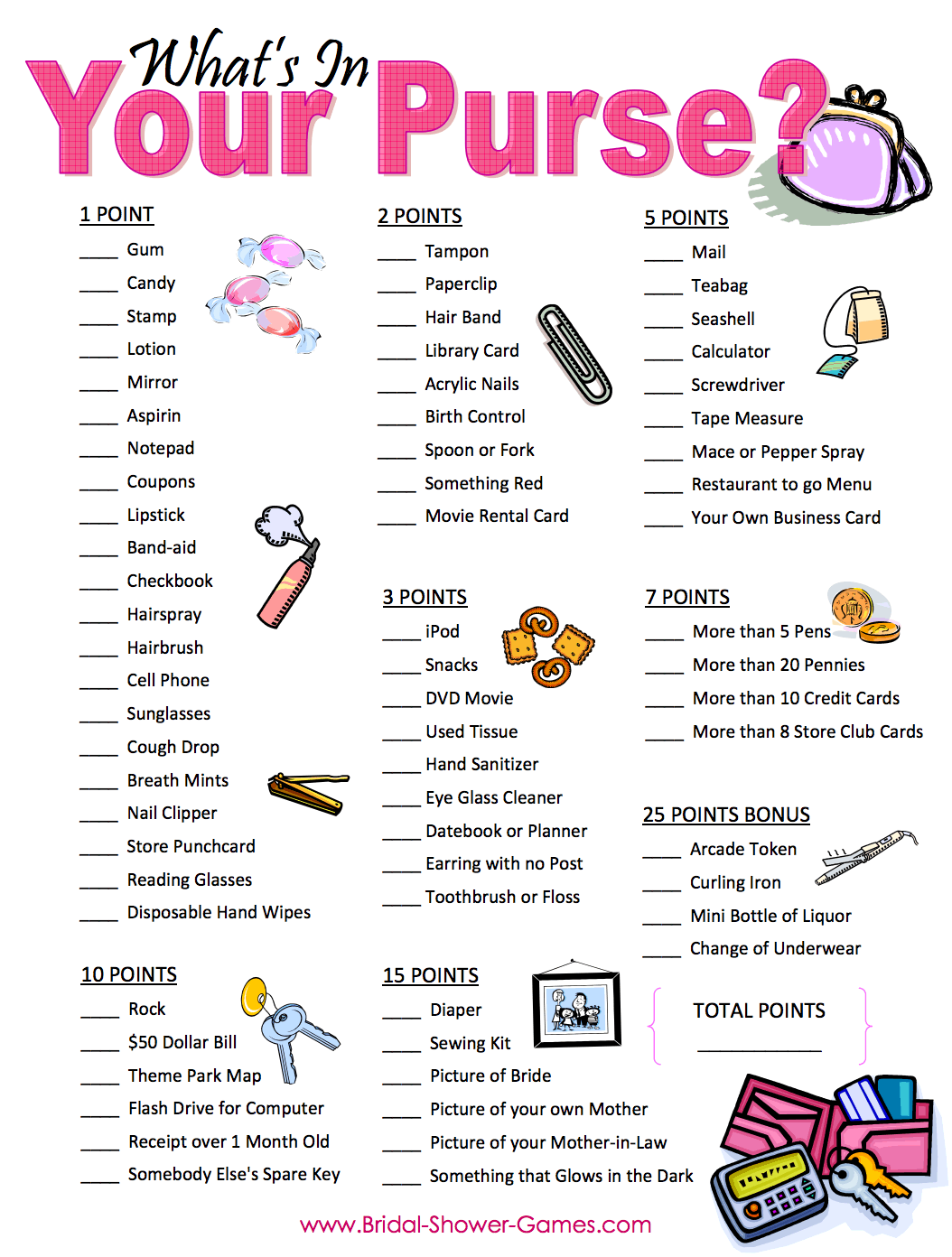 5. What’s In Your Purse? :Now, this Free Printable Baby Shower Game is one that I’ve played and LOVED. When I attended a bridal shower last year, I was asked to open up my purse and check off all the things that I was carrying.