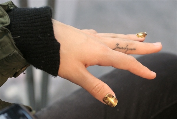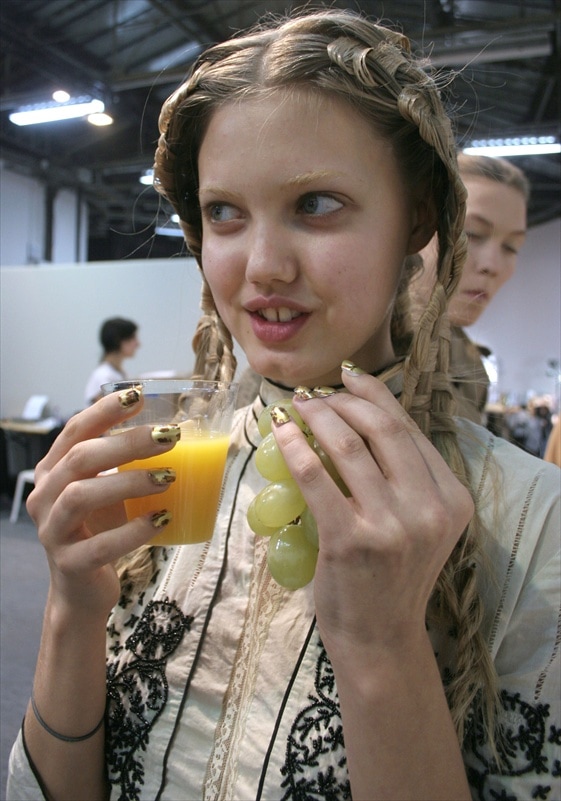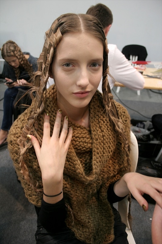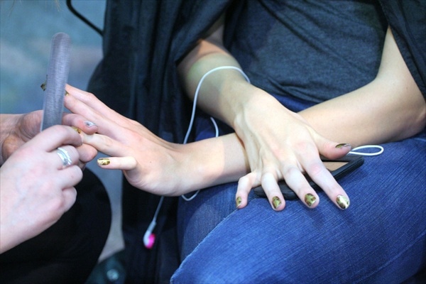 Minx, still the hottest thing in nails, created some sleek new designs to go with the fabrics of the collection. Minx co-founders Janice Jordan and Dawn Lynch-Goodwin met with U.K. nail stylist extraordinaire Marian Newman to decide on the designs, inspired by swatches of fabric from the collection. Marian headed the team that minxed the girls at the show. The designs chosen were a gold design that looked like leather and a leaf motif layered over a matte gold Minx base. The natural nails were kept oval and short. The nails were the perfect complement to a collection filled with decadent fabrics and elegant designs.