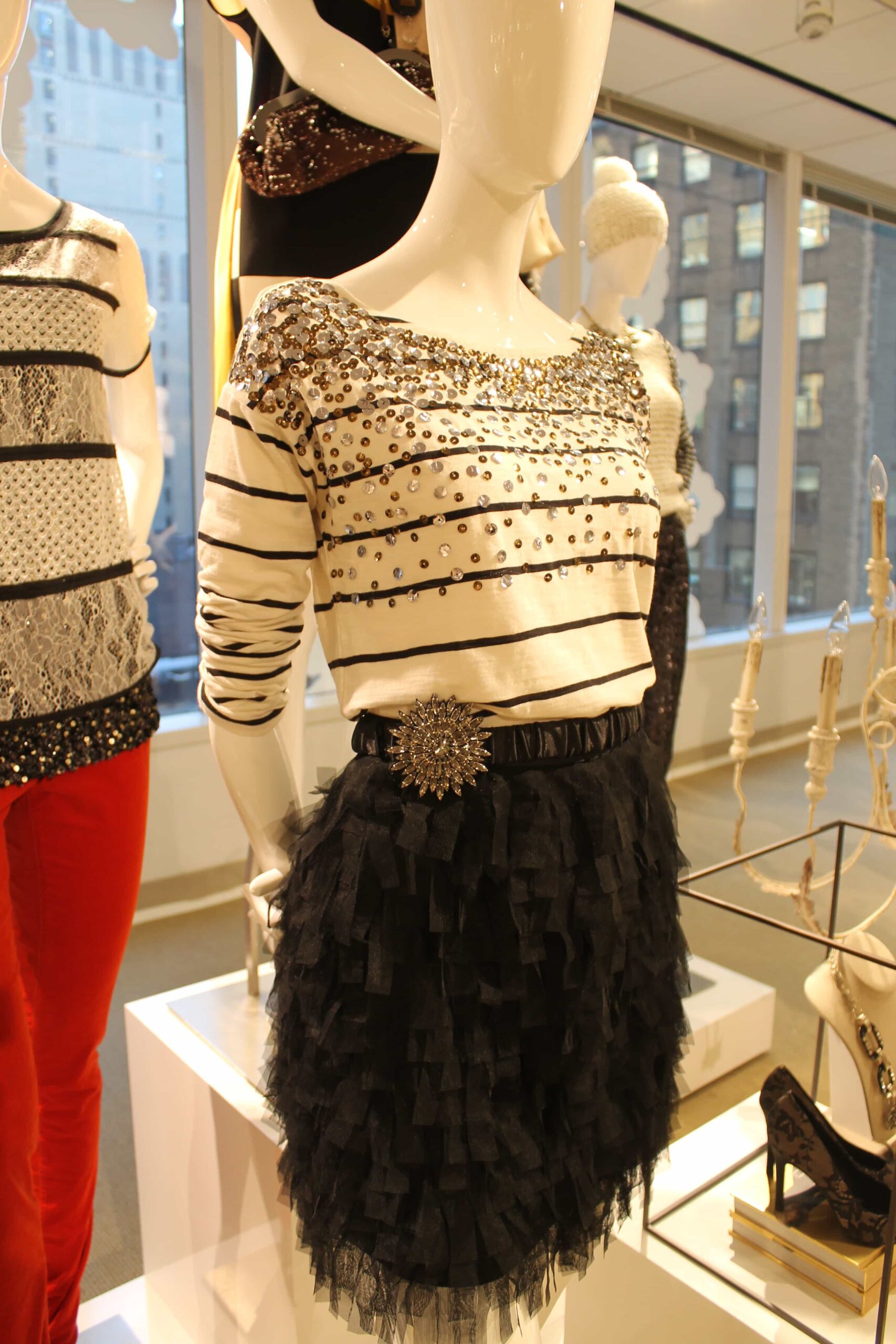 I own a lot of pieces from Loft – including clothes and accessories – and I always get compliments on them. Nearly every piece in this collection is compliment worthy – the standouts feature mixed textures: sequins with knits and feathers complimenting stripes. My favorite looks are these two from the “Deco” girl capsule: