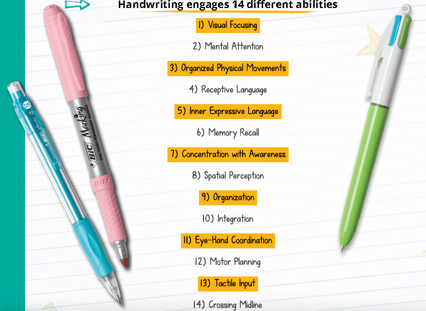 The importance of writing simply can’t be overstated. Did you know that handwriting engages 14 different abilities? That’s crazy! Take a look: