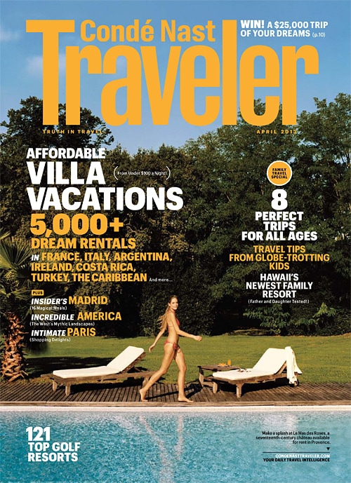 Conde Nast Traveler has just released their fabulous, first-ever Family Travel edition (April 2012)! It talks about all the things that parents seem to freak out over and why not to…dealing with long flights, things to do at places that don’t have “theme” and “park” in their name (though this is great, too), finding unique things to do so that the trip is fun, educational, and memorable for the entire family. They cover a group of reader favorite destinations very nicely, including: Bali, Buenos Aires, Cape Town, Florence, Kyoto, Paris, Vienna, and African Safari. There’s also a great feature on how to land a great, affordable villa in places like St. Bart’s, England, Costa Rica, and Turkey. I really think this is a great introduction to the magazine for people not familiar with it…and it’s great for families nervous to take their kids on trips “exotic” in nature! Check it out.