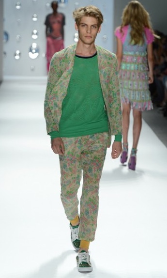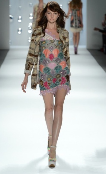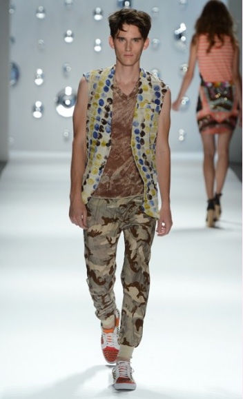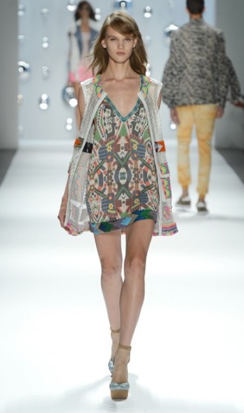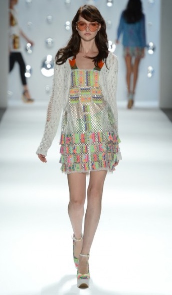 It was a retro rewind at the Custo Barcelona Spring 2013 runway show on Sunday. The always outgoing line debuted its collection with bold patterns, bright colors, and lots of texture and fringe. Paired with tinted visors and long sleek hair, the season begs of a return to the ‘70s.