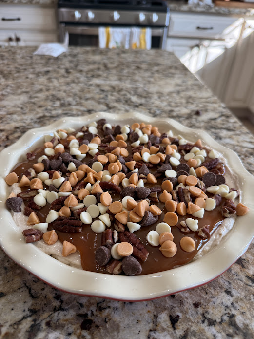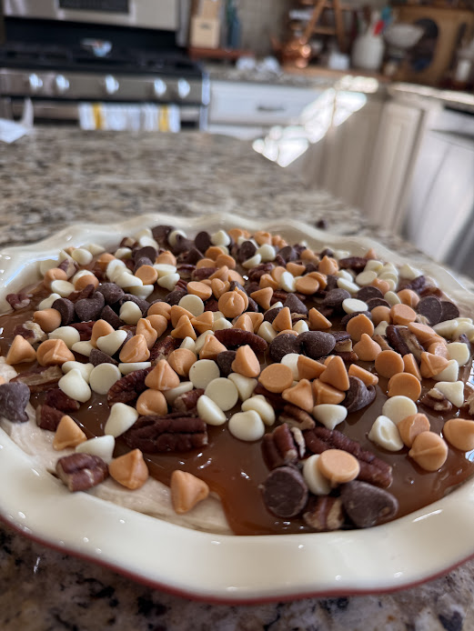 - Layer with caramel sauce, chopped pecans, and a sprinkle of chocolate and toffee pieces.