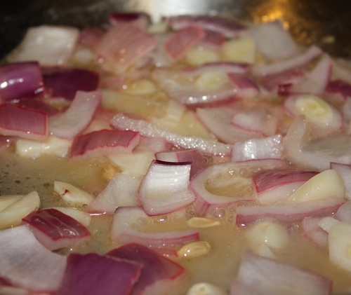 Boil pasta as directed. Saute red onions with garlic, juice of one lemon and oil. Be sure to pick out the seeds. They are not pleasant to bite into.