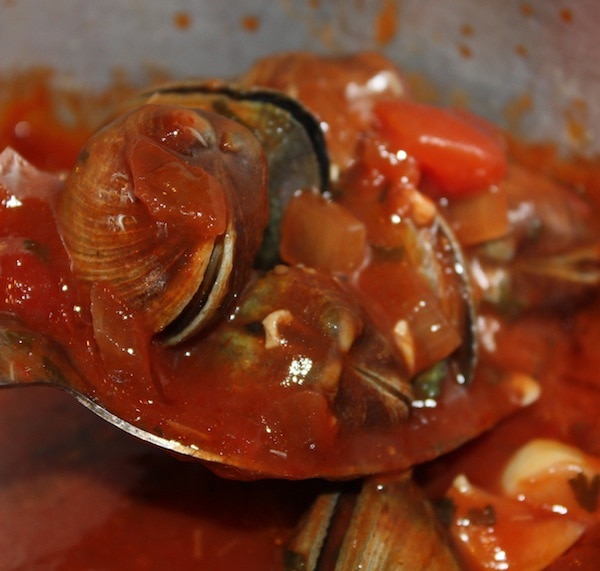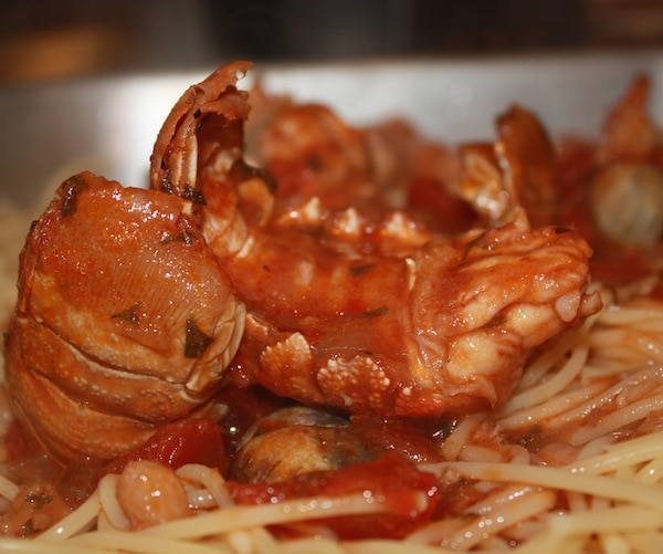 Sautee onion and garlic and pepper flakes in oil. Then add wine and sauce. Bring to a boil. After it cooks for about 20 minutes, add your clam sauce. Then put in clams, lobster tails, shrimp and scallops. Bring back to a boil. If the clams are open, and your shrimp / lobster tails are pink – you are done! Serve with pasta.