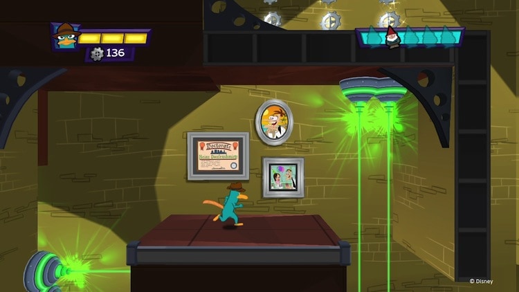 - Action Mode: Transform Perry from subdued pet mode to super Agent P: jump, run, crouch, slide, hang from ledges, fight robot “inators” and sneak past traps and obstacles in Doofenshmirtz’s diabolical lab.