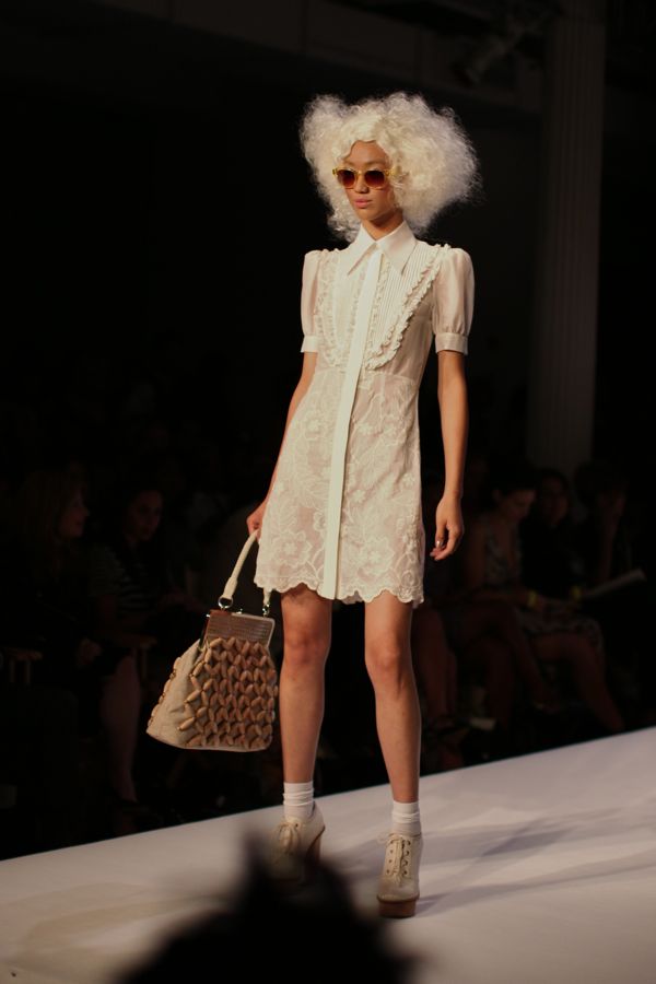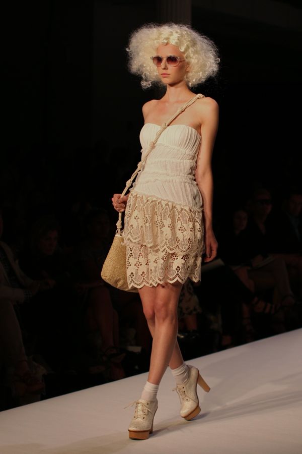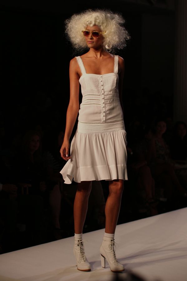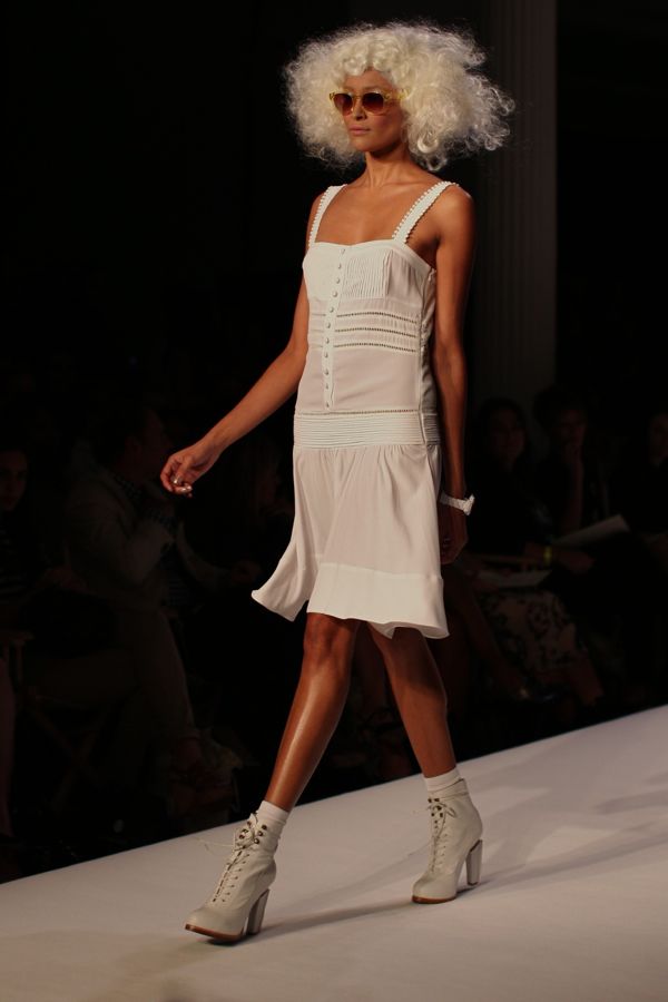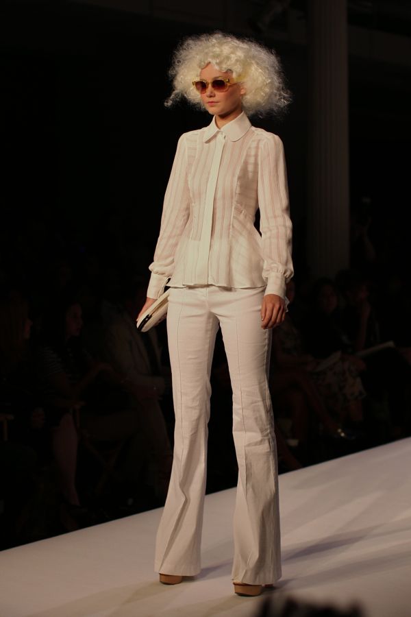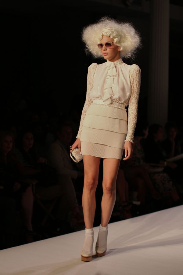 The Bebe Spring/Summer 2012 collection is absolutely my kind of clothing. Whimsical, romantic, and soft, this collection was presented entirely in whites and creams and ivories. Just about the only color on the runway was the makeup, which featured bright pink cheeks and baby pink lips.