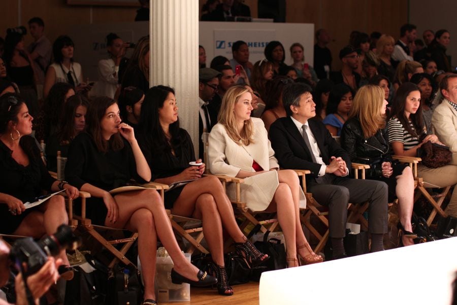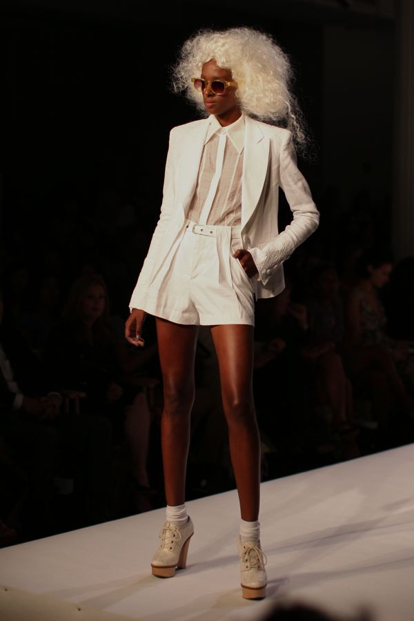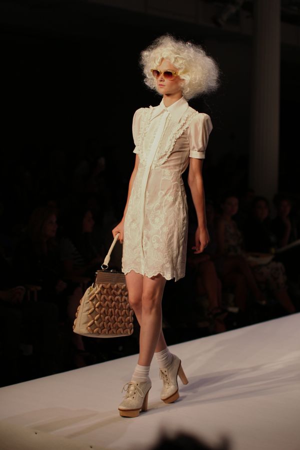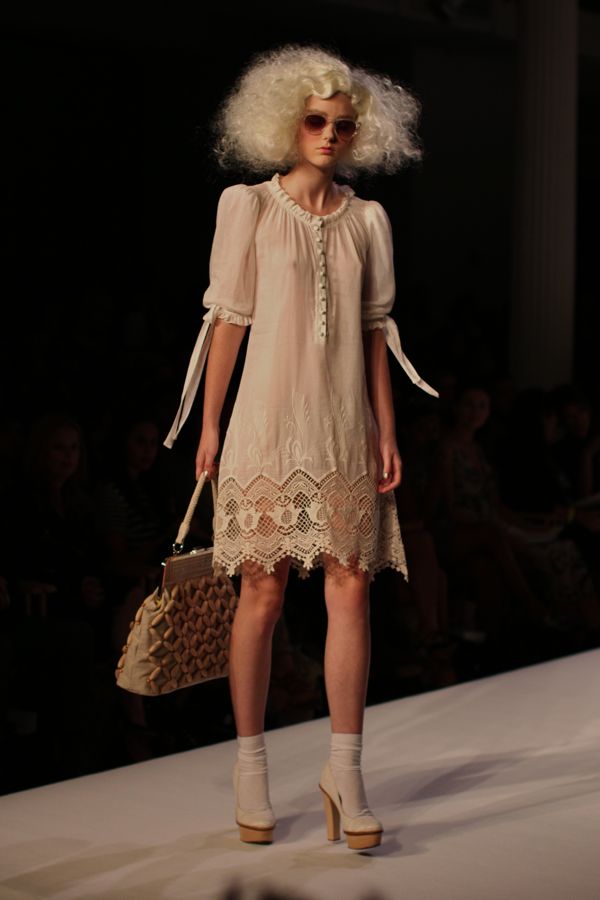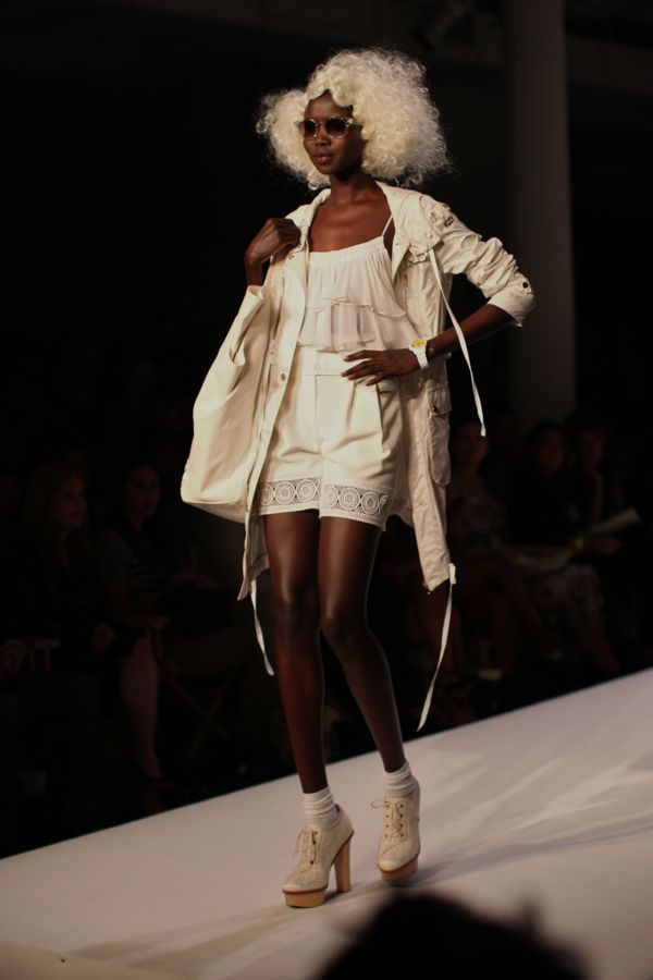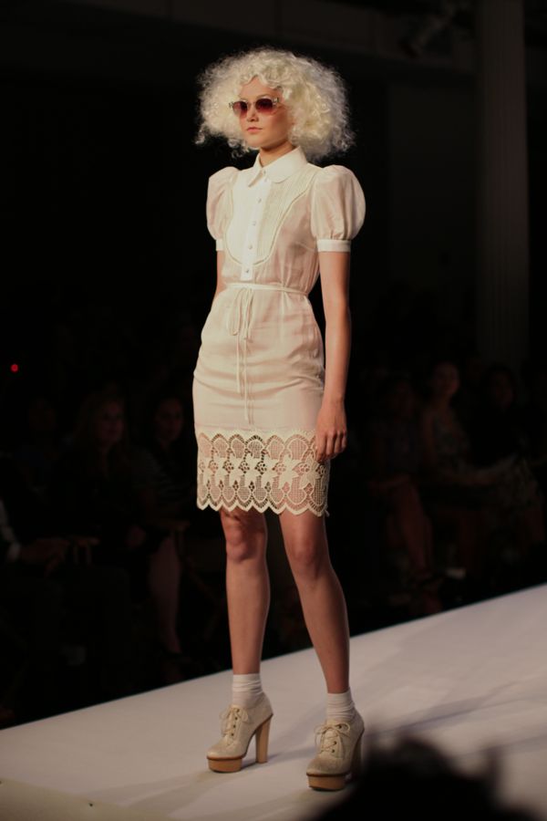 The Bebe Spring/Summer 2012 collection is absolutely my kind of clothing. Whimsical, romantic, and soft, this collection was presented entirely in whites and creams and ivories. Just about the only color on the runway was the makeup, which featured bright pink cheeks and baby pink lips.