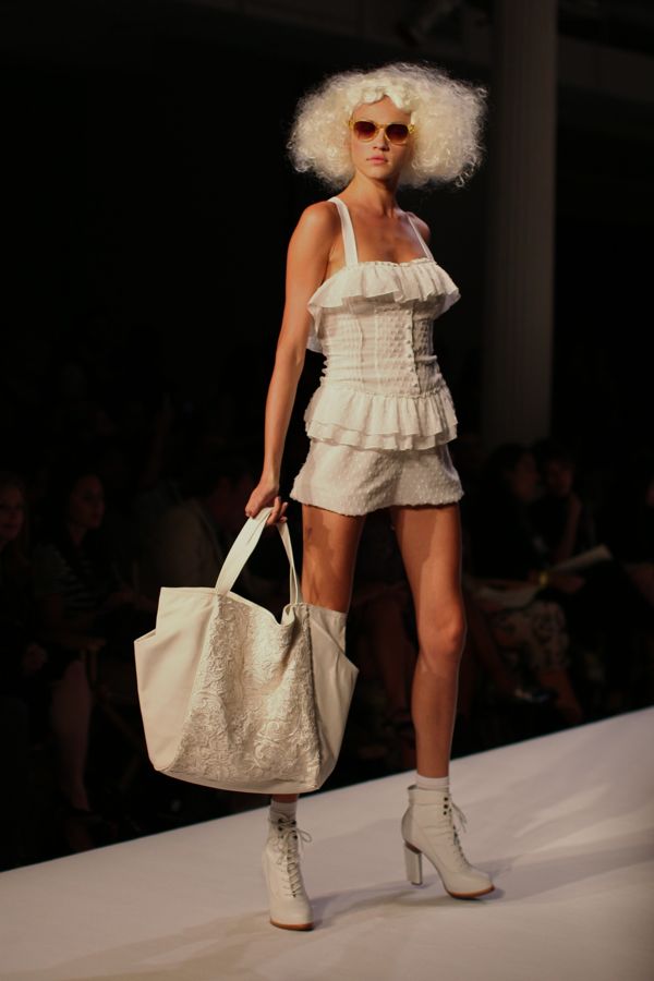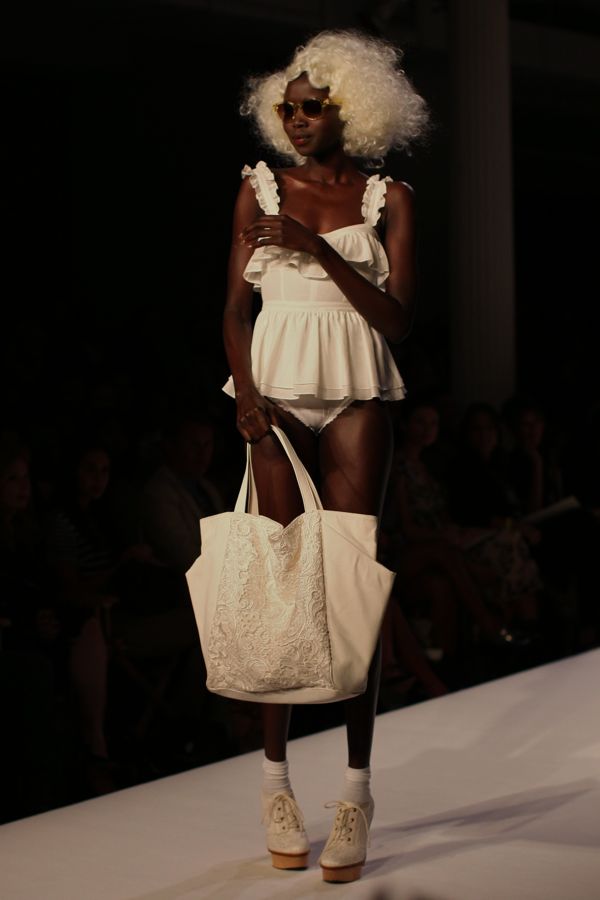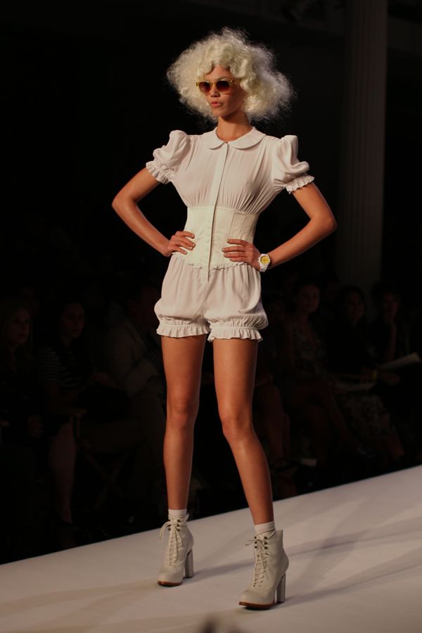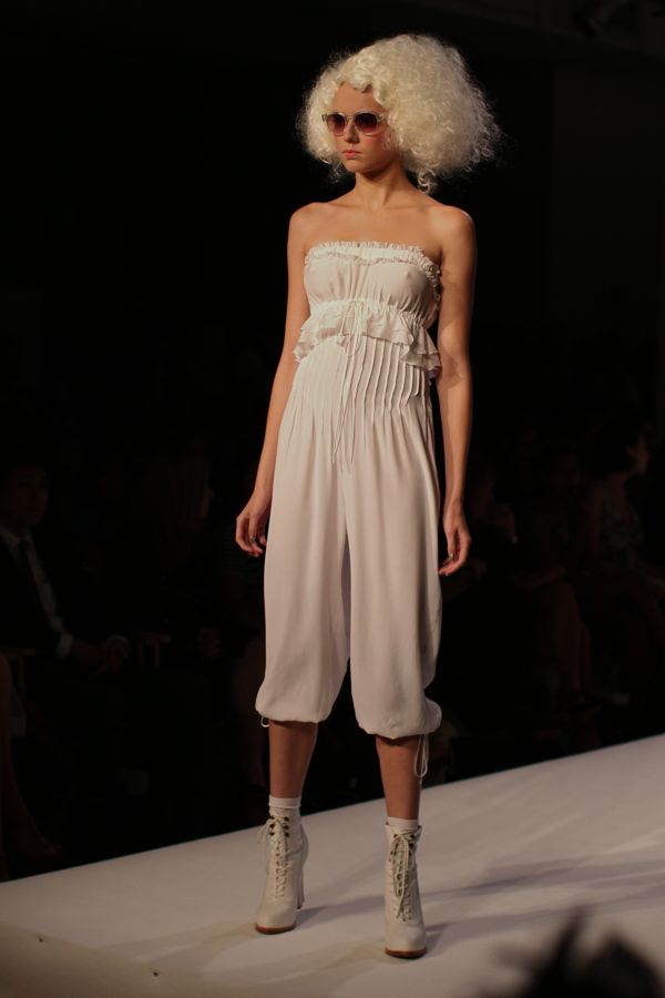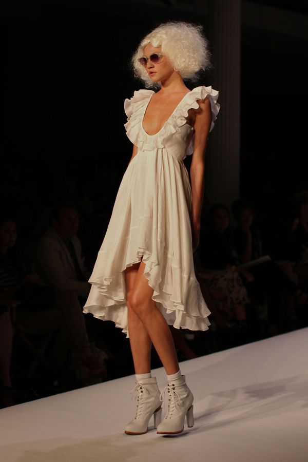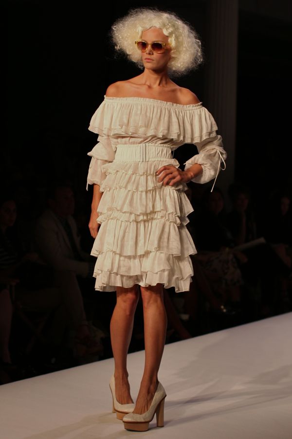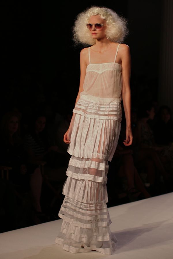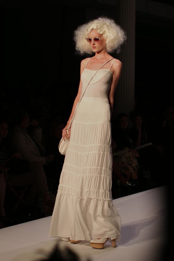 The models wore giant white wigs, sunglasses, and white boots and socks, and this uniformity really helped to show off the intricacies and details of the outfits. Skirts flowed and draped, and ruffles were found everywhere in the collection, from the bathing suits to the maxi dresses. Sheer organza and lace detailing could also be found throughout the wide range of pieces that included corsets, pantaloons, tailored jackets, and wide-legged trousers.
