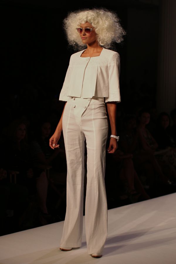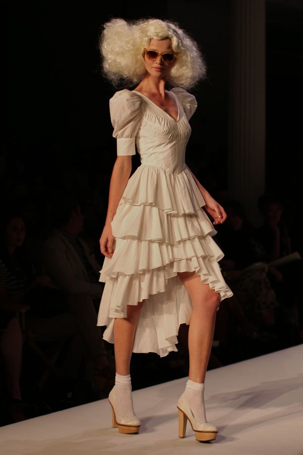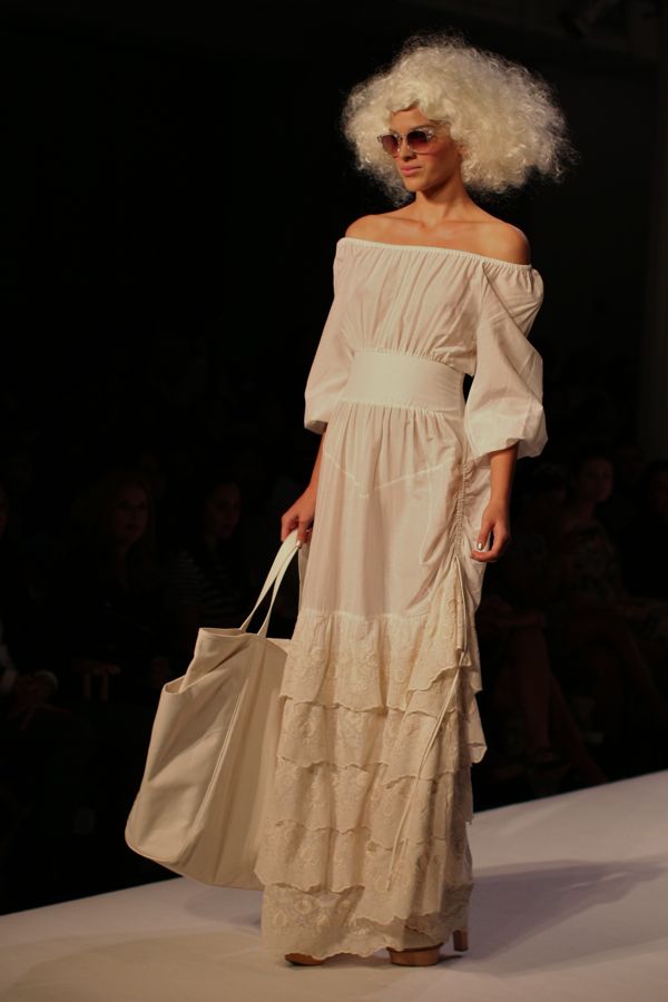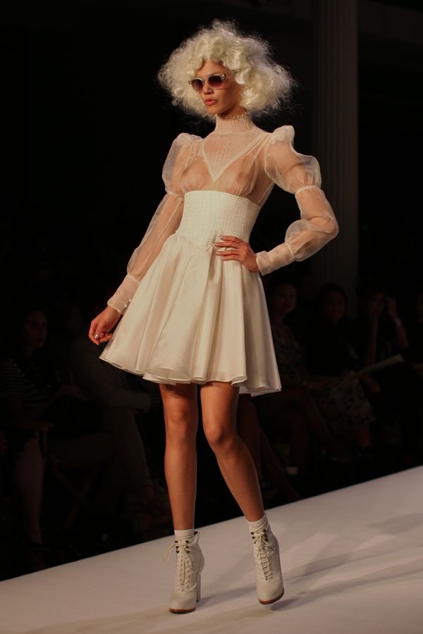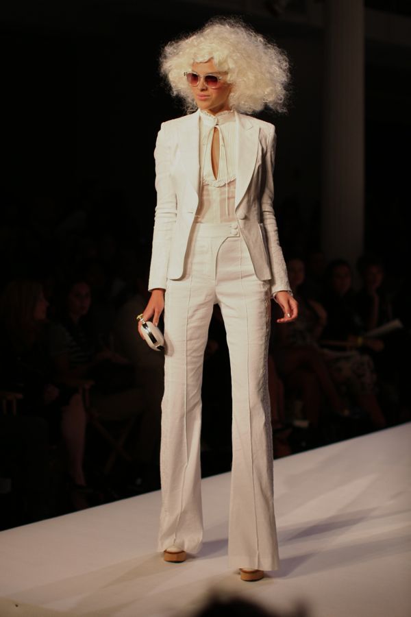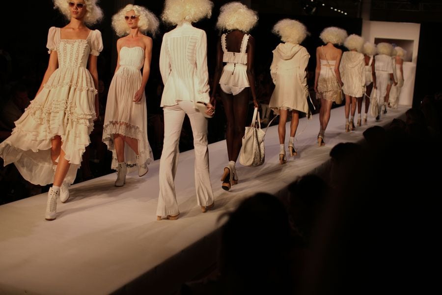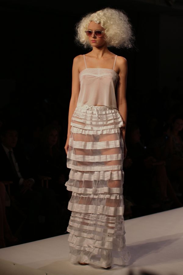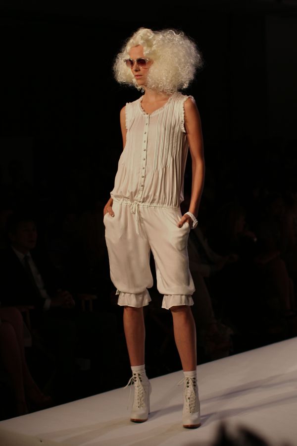 The models wore giant white wigs, sunglasses, and white boots and socks, and this uniformity really helped to show off the intricacies and details of the outfits. Skirts flowed and draped, and ruffles were found everywhere in the collection, from the bathing suits to the maxi dresses. Sheer organza and lace detailing could also be found throughout the wide range of pieces that included corsets, pantaloons, tailored jackets, and wide-legged trousers.