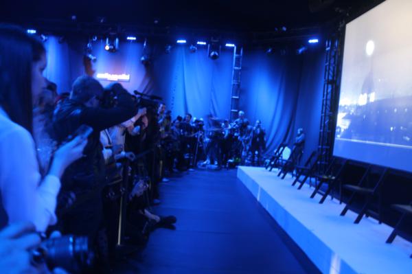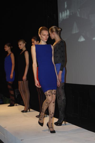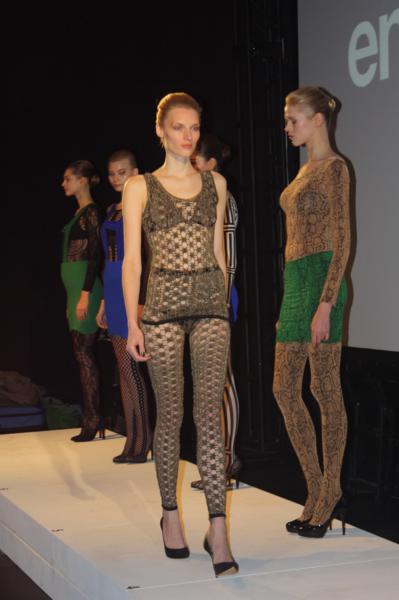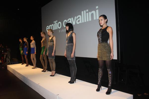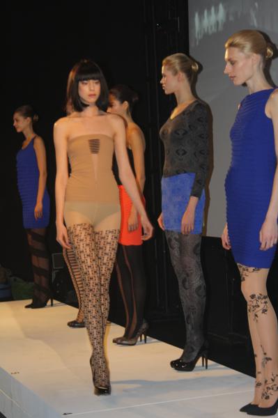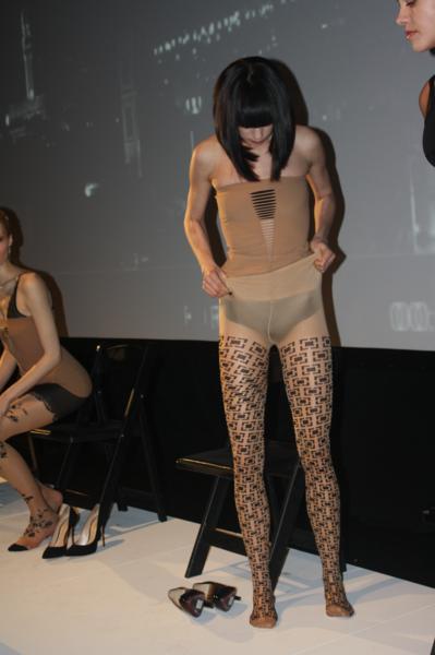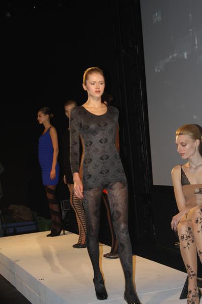 Emilio Cavallini is a legwear designer. The ability to commander an entire fashion presentation based on legwear required some pretty noteworthy legwear. The models came on stage with bare necessities on. They sat on chairs. They, then, put on legwear in a very sexy fashion that made me realize how unsexy I put mine on. I should put more effort into that. Then, they walked to a woman on the side of the stage who dressed each one in an assortment of minis and dresses, none of which detracted from the legwear. The first words that came to my mind were sexy and sensual. There were elaborate patterns and interesting details. Paired with black pumps, the legwear clearly took the spotlight. A short film was shown in the middle of the presentation, in which a woman tried on different legwear options from Emilio Cavallini. It was clear that she enjoyed her body. She changed several times before settling on one that she wore over her thong. After this film, a next batch of legwear with minimal clothing was shown.
