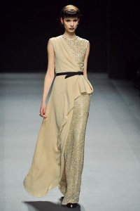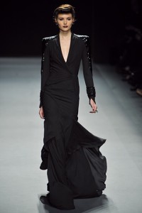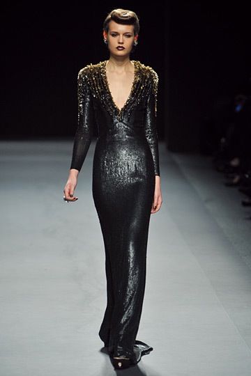 The Jenny Packham collection was comprised of evening gowns that smoldered and demanded to be noticed. The collection featured lots of gowns in black, red and champagne with glittering details that made each look like a walking piece of art. In keeping with the 1940’s film noir inspiration, the gowns featured silhouettes with wide shoulders and cinched waists. The models were all styled with retro 1940’s hairstyles and large art deco inspired earrings that enhanced the overall Film Noir vibe of the collection.