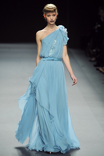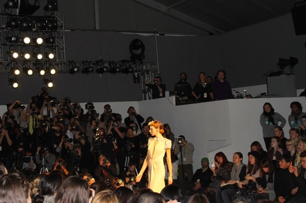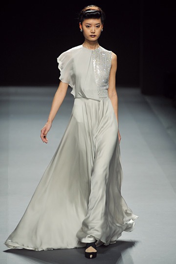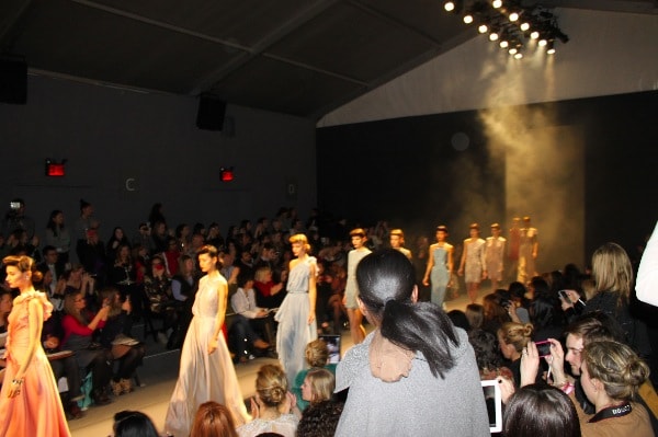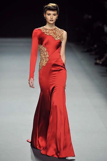 Jenny Packham was the first collection that I attended this Fashion Week and what a way to kick it off! Jenny Packham’s Fall/Winter 2012 collection was inspired by 1940’s Film Noir, and it dazzled from the moment the lights went down until the last model left the stage. The show began with fog emanating from backstage in front of red backdrop as burlesque music played. All of the sudden from the fog appears the first model in a drop dead gorgeous fitted red slinky gown. The effect was so dramatic that you could literally hear the audience gasp, and the show only continued to dazzle from there.