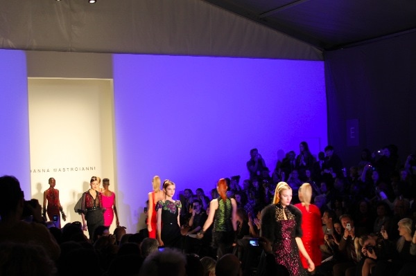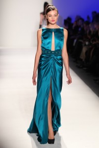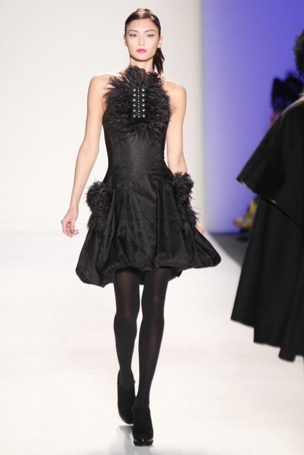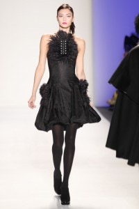 The Joanna Mastroianni collection was a sea of colors: magenta, jade green, cherry red and peacock blue. Feathers also abounded throughout the collection from chic black feathered cuffs to peacocks feathered gowns. The particular standouts of the collection were the pieces with white or jewel-toned gowns overlaid with delicate caviar beading that formed an elegant web creating a piece that was even more stunning than the sum of its parts.