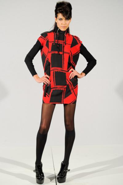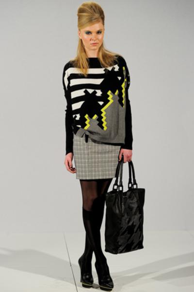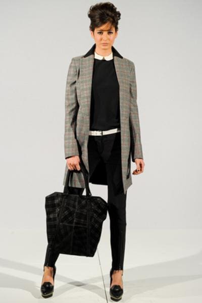 The L.A.M.B. Fall 2012 collection evoked images of a punk, naughty librarian. It contained liberal doses of plaid and checks, contrasted by neons. The ever-popular Peter-Pan collar was clearly a favorite here. The buttoned-up librarian look was emphasized by the short hems of the skirts. The girls were typical Gwen Stefani…a bit cheeky, ever-so-stylish and chic. I loved that a clean palette of black and white was used for prints with strong graphic lines, sometimes with shots of color. Punctuated with pops of bright yellow and red, the clothes definitely stood out.