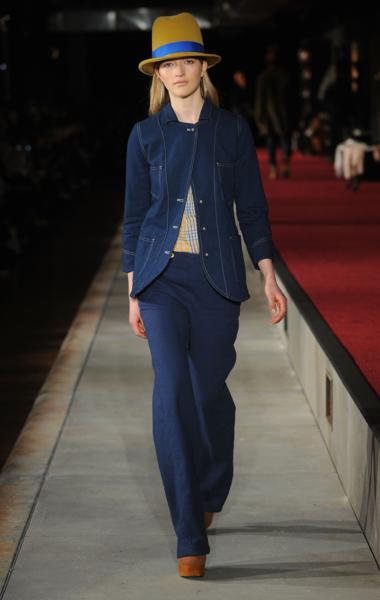 The female models on the Levi’s runway sported stick-straight locks and most wore almost masculine hats. In contrast, some of the male models rocked full beards and bushy hair. This contrasted with the clean straight lines of the clothing.