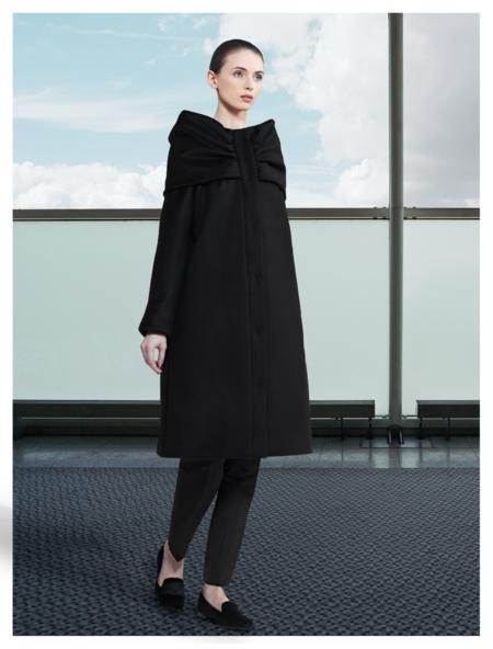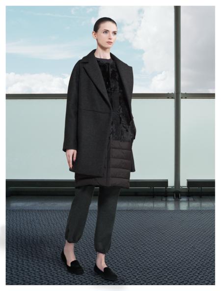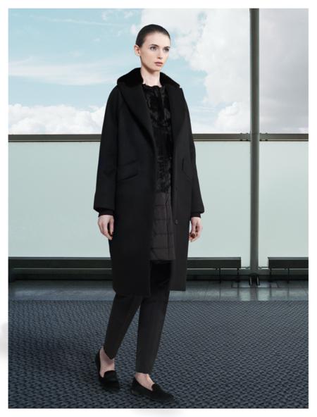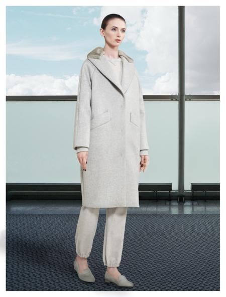 10 coats were presented. The fabric used included double-faced cashmere, melton and pure camel hair. There was also the use of fox fur as cuffs on sleeves and collars. The color story was a gentle mix of greys and beiges with blacks. The coats appeared to be very warm but there were also detachable pieces to increase the warmth factor. An entire layer made of fur could be worn on the inside of a coat. A jeweled collar could also be attached to the coat for a glamorous effect. There was also a detachable fur collar. There were some basic tops and pants, as well. The emphasis, again, was clearly on comfort. The clothes were roomy and forgiving. One pair of pants had elastic at the hem. There was a bit of a sporty element to these items, that contrasted nicely with the elegance of the coats.