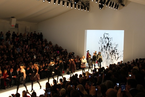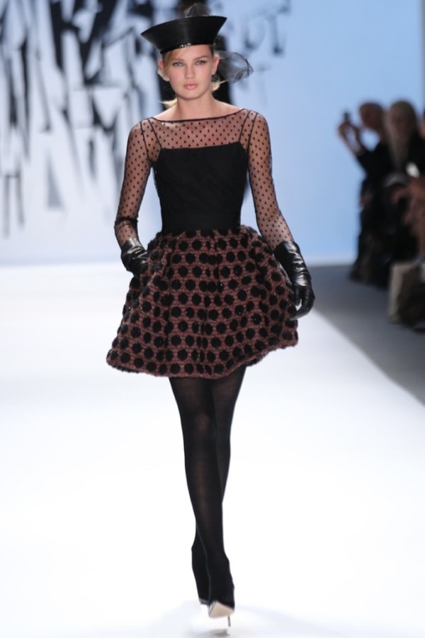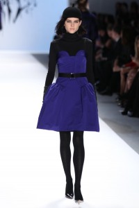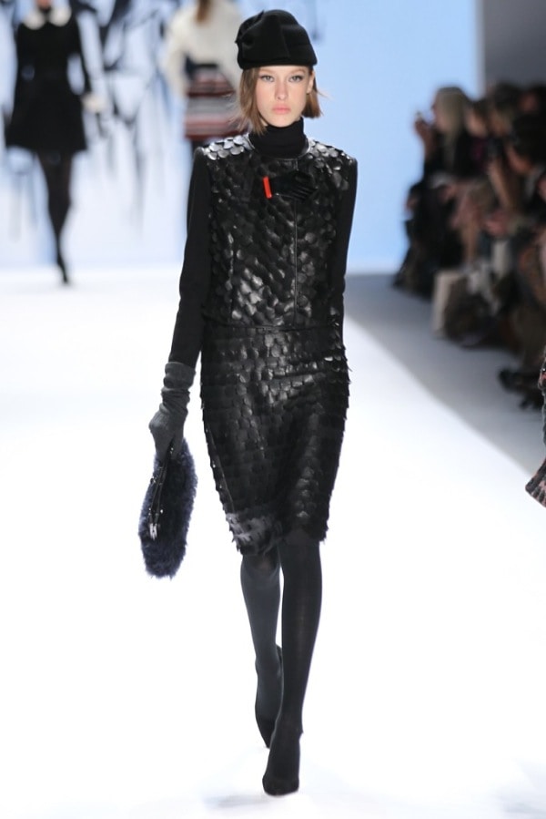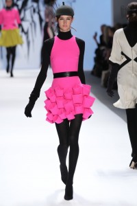This season the design details were the element that truly made the Milly collection a standout. Several pieces featured overlapping scallops, bubble skirts or origami construction that made for some dynamic silhouettes. The hot pink cocktail dress with origami construction in particular (pictured below) had the audience buzzing from the moment that it emerged on the runway until it disappeared backstage.