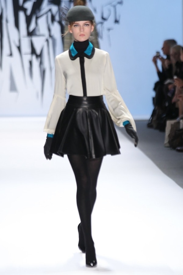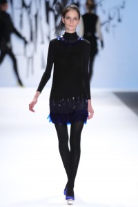 The Milly collection was array of different fabrics including laminated tweeds, taffetas, leather and silk. The runway looks were each styled with chic black hats that looked like a fashionable cross between a beret and a beanie and further enhanced the “Future Perfect” theme of the collection. The final highlight of the show was Michelle Smith’s adorable daughter, Sophia. Sophia, the face of the Milly Minis line, popped out of her seat in the front row to join her mother when she came out to take her well deserved bow at the end of the show.