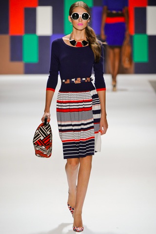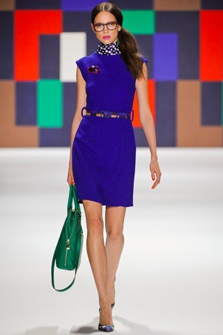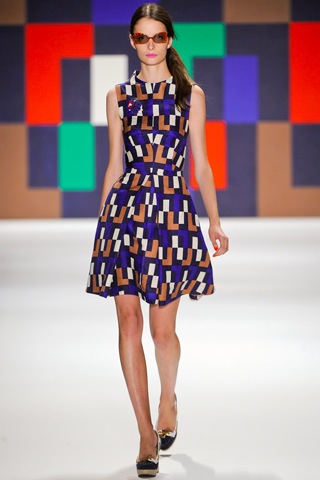 The backdrop of the runway was a geometric print canvas in red, blue, green and brown that not only added atmosphere to the show, but also served as the color palate of the collection. The clean, simple silhouettes did an excellent job of keeping the bold print from being overwhelming. While a departure from the look of previous Milly collections, the bold prints and clean lines were certainly a crowd pleaser.