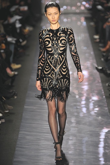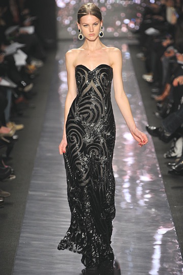 The Naeem Khan collection itself was a glittering combination of whites, blacks and golds the dazzled in everything from plunging necklines to one-shoulder gowns to head-to-toe beaded gowns that were glittering columns of elegance of fabulousness. The collection also included several gowns with ostrich feather skirts that dazzled among the beaded decadence of the glittering collection. The beading on several gowns was so extensive and intricate that you could actually hear the detailing on the gown chime against itself as it glided down the runway.