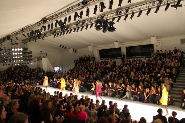 The Nanette Lepore show began to the Beatles When I Saw her Standing There which perfectly set the tone for the vintage tableau about to unfold. The star-studded front row included Stanley Tucci, Kristin Chenoweth, Matthew Settle and Kelly Rutherford. The collection was an explosion of color featuring deep burgundy, peacock blue, gold and chartreuse. The brilliant color palate was paired with vibrant prints which complimented, rather than competed with the dynamic color palate.