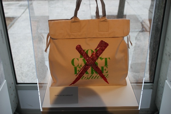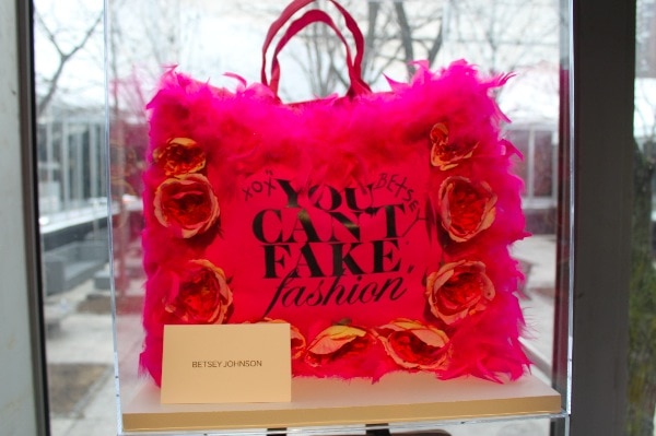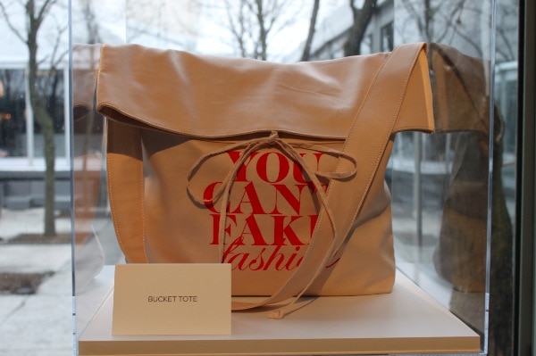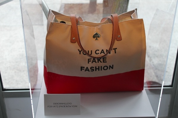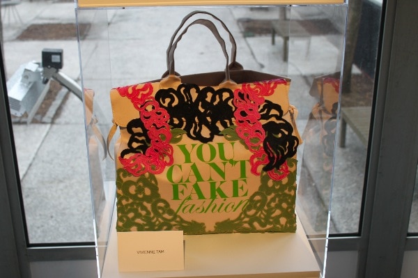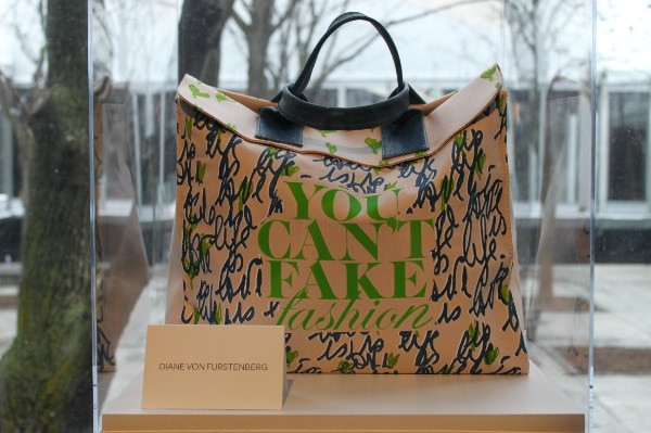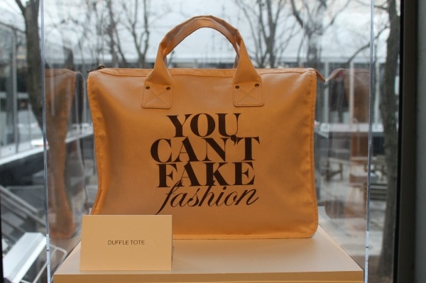 Although the chic designs of Fashion Week look effortless as they glide down the runway, each garment that is showcased during the Fashion Week shows and presentations is the result of hundreds of hours of work by very talented designers. The leveraging of the time and talent of others without credit or compensation is what makes counterfeit goods such a travesty. During Mercedes Benz Fashion Week the lobby of the tents included a display of some chic and eye-catching canvas totes all bearing the same message “You Can’t Fake Fashion!”