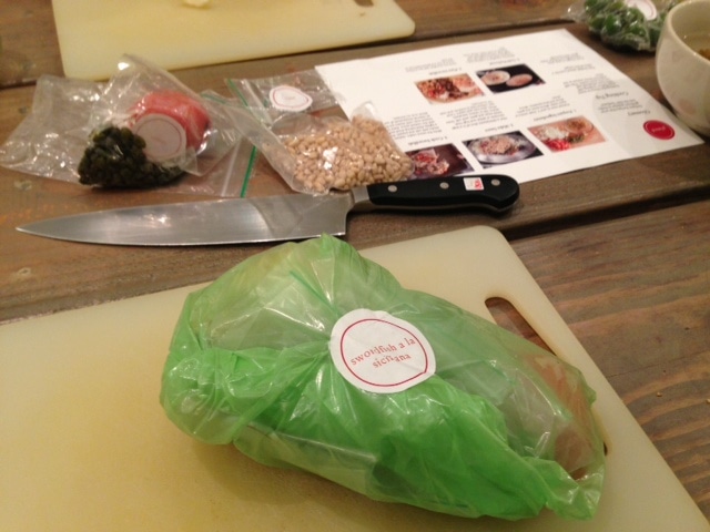 Inside are (as you can see in the background of the photo) the individually portioned ingredients for the recipe. Each recipe is around $30 for 2 servings.