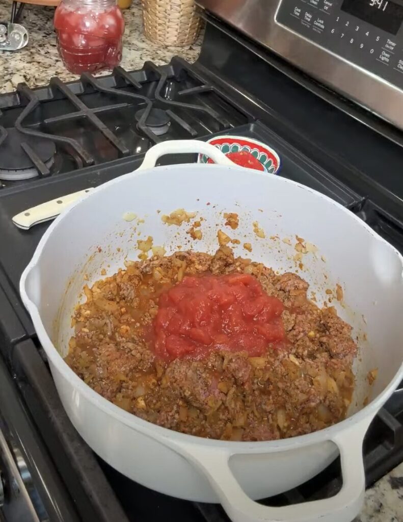 Then add your sauces, beef broth, and beans. Stir. Do not cover. Cook on medium low. Keep a slow, rolling boil and stir often. If you have more time, cover and cook for an hour.