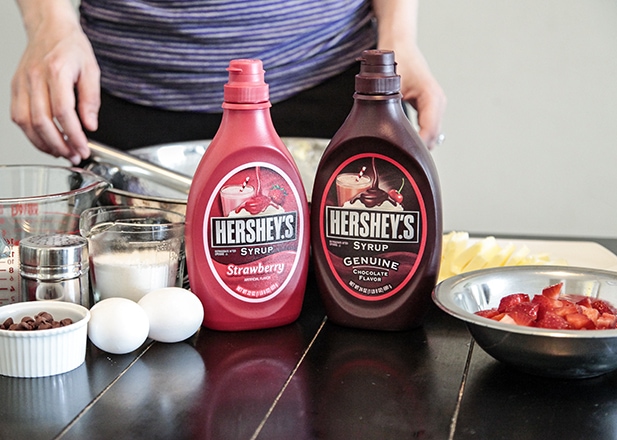 Since we already have butter in the batter, and we want to create a ‘from scratch’ recipe that is even more delicious, we’re going to bypass the unnecessary oil and water and go for the good stuff we would all rather be eating anyway: HERSHEY’S Chocolate Syrup.