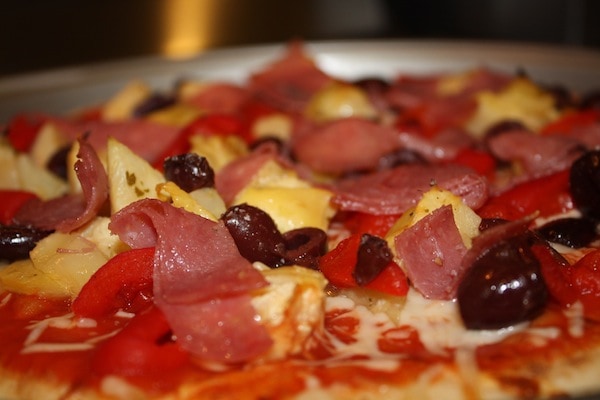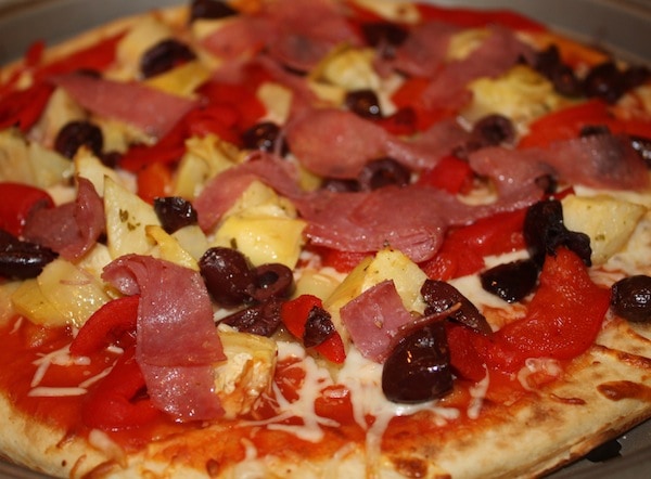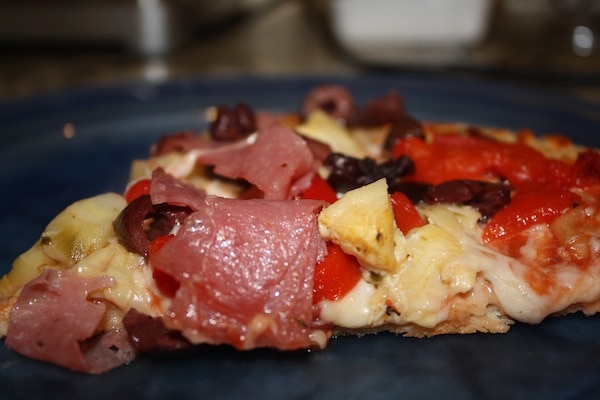 YUM! I made this last night because I was DYING for some antipasto. I worked with what I had and what I had was a Boboli crust. Here we go!