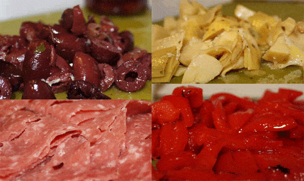 This is SO EASY. Preheat oven to 450 degrees – follow directions on Boboli package. Chop the olives, peppers, artichokes and salami. Set aside.