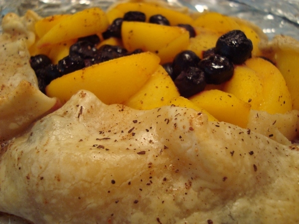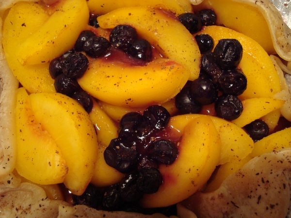 Place as many peaches as you can fit starting in the center and working your way out. I really jam as many as I can, leaving just enough room to fold up the edges. Just don’t pile too high, and you will be fine. Add the blueberries on top of the peaches. Scatter evenly.