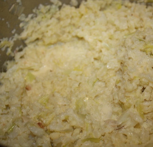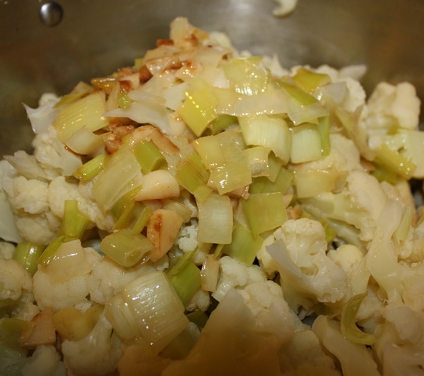 - Using a food processor and working in batches, puree the cauliflower and the leek mixture with the cream. — This is what you were supposed to do but I don’t have a food processor…. so first I combined the ingredients and added the cream.
