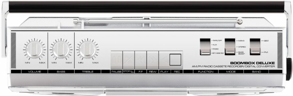 - 80’s-style retro stereo cassette boombox