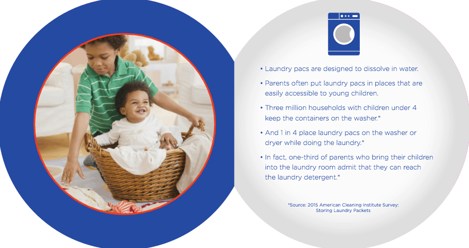 - Keep laundry products out of the reach of children at all times – even between loads. Never place a laundry packet on the top of a pile of dirty laundry. They should never be outside of their container and accessible to children.