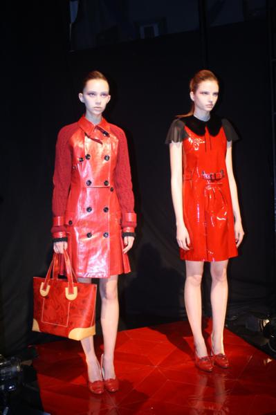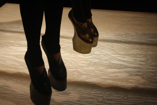 These leather designs were integrated with other fabrics. The leather used looked very drapeable and of fine quality. The designs themselves were unique and a bit avant garde. Japan is known for being fashion-forward and for being a bit more fearless than us Americans, when it comes to fashion. It’s been my observation that the silhouettes appear to flow around the body, as opposed to clinging to it. These items were very similar to this aesthetic. There were both men’s and women’s clothing. The models were changed after some time so that new ones could come out. One of the items that stood out for me was a Gaga-esque shoe design. The black leather dresses that these were worn with were so intricately designed that the fabric didn’t even look like leather. Who knew leather could be manipulated like that?