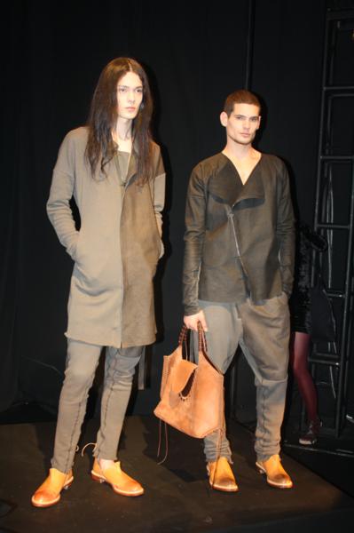 Leather Japan‘s presentation featured clothing from various designers, including Le Parrain, Somarta and Aguri Sagimori. This collaborative was made especially unique by the collection of bags suspended from the ceiling in the middle of the room. These bags were from Genten.