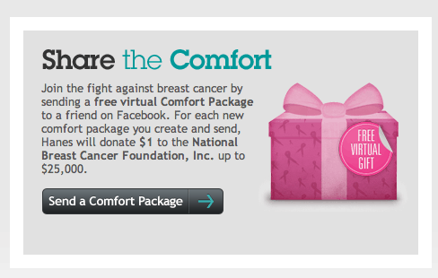 Join the fight against breast cancer by sending a free virtual Comfort Package to a friend on Facebook. For each new comfort package you create and send, Hanes will donate $1 to the National Breast Cancer Foundation, Inc. up to $25,000. Click here to participate!!!!