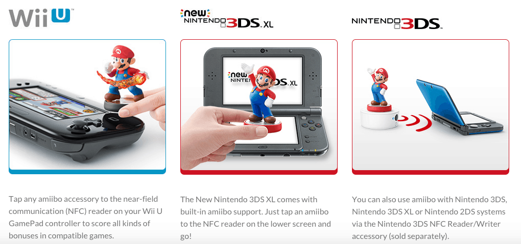 The Amiibo combines your favorite character figurines with video game awesomeness. You can play the games with or without the figures! What’s even better…you can use the figures with the WiiU, the 3DS XL and the 3DS…without having to get any extra hardware or platform pieces! It’s already there! Just take a quick look: