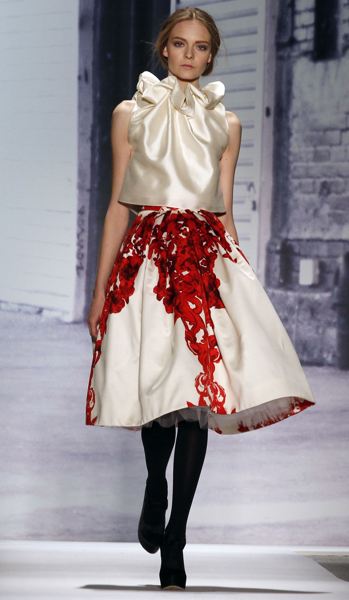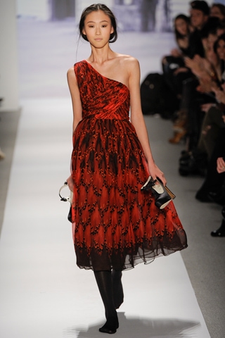 There were many offerings of simple blouses and skirts for liberal mixing and matching. One of my favorite casual looks was a pair of relaxed black trousers that cut above the ankles and a white sleeveless loose blouse. This was paired with strapped flats. This look is so classic in its use of black and white, but manages to be effortlessly modern with exposed arms and ankles. I also loved the mix of girly fabrics with leather. One look was a water-color print on a white fabric done in a below-the-knee dress. This was worn with a black and brown leather bomber jacket. The contrast of light and feminine with no-nonsense leather was delightful. The highlight of the show was definitely the dresses. There was a white strapless dress with a full skirt, adorned with black and white appliques. This look works on everyone. The full skirt can camouflage problem hips and thighs or add volume to a boyish figure. I also loved the gold bustier dress with chiffon-like fabric falling over the front and ending at the waist. A structured red mini was worn with black stockings. Then there was the one-shouldered red and black dress with ruching detail throughout. Though the dress was lovely, the winner was the model, who lost one shoe mere steps into the runway. She bent over and spent a nerve-racking amount of time struggling to undo the strap on her other T-strap heel. When she finally did, she held both shoes in her hands and strutted the runway like it never happened.