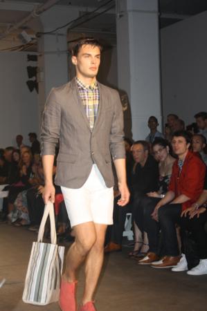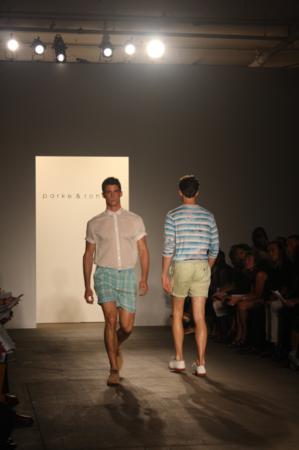 The inspiration for the collection was Spain. This was evident in the sensually happy prints seen on some swim trunks and shorts. I loved the use of turquoise and bright yellow with regular plaid. The combination looked effortlessly cool, like a man who was born knowing what looks good on him and dresses impeccably with no extra effort, at all. One of my favorite items was a tangerine blazer. Paired with shorts, this is evening attire for surfers. Color on men’s blazers are not a frequent occurrence and I liked that Parke & Ronen went there, challenging their man to up the interest at the office, even. I love that scrunched sleeves are still a thing of the present. For the finale, the male models strutted out in white vests with flowers on the chest and bare feet.