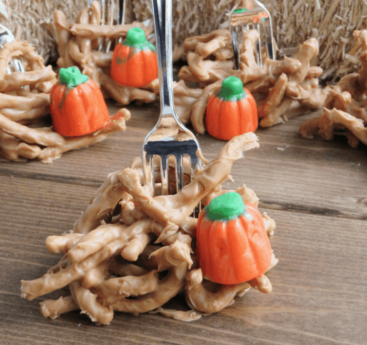 Drop by teaspoon on a parchment covered cookie sheet. You can take your fingers and stick a few up or keep them all flat. Add a candy pumpkin to the side of the haystack. Make sure the pumpkin is touching the noodles. (They will stick once they are cooled)