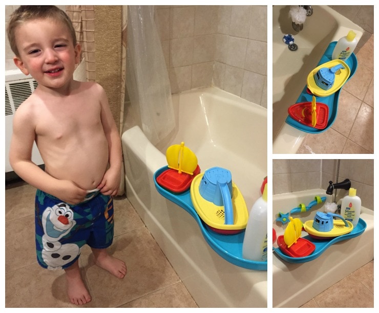 Indeed…and Caleb absolutely loves the Shelfie. He can’t get enough. He actually tries to put the shelf on the tub himself if Natalie or Liam took it down! He’s obsessed…mommy’s little boy! Remember, though, as great as it is, Shelfie is designed to hold anything BUT the child (children should not sit or stand on Shelfie)…had to include that little PSA there.