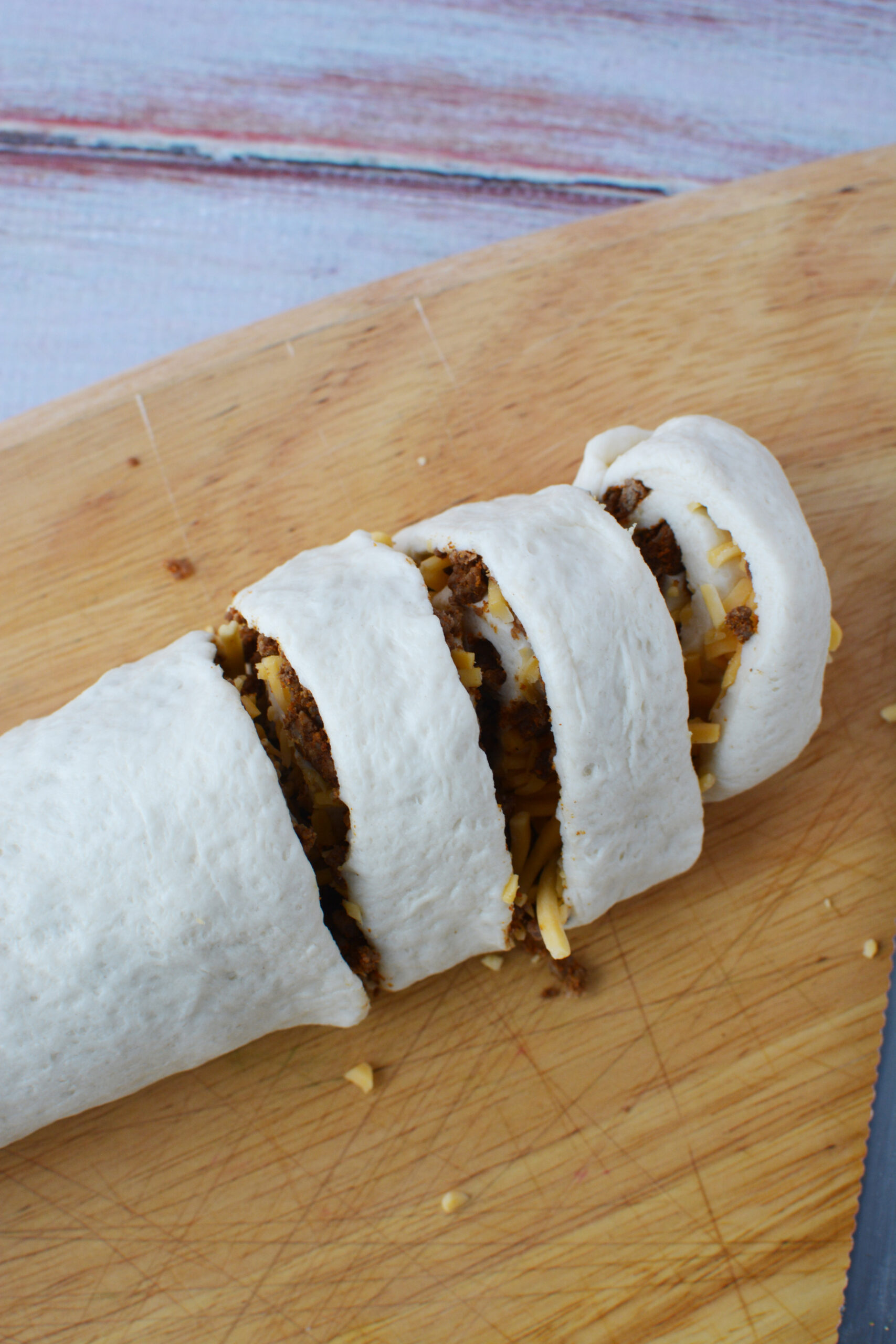 Add meat to the top of the dough and top with cheese. Starting with the long edge of the dough, tightly roll the dough into a log, pressing the seam tightly together and rolling the log so the seam is on the bottom. Use a serrated knife to saw and cut the dough into 1" rounds, yielding 12-14 rounds. The key is to cut the entire roll and then move the slices to the baking sheet.