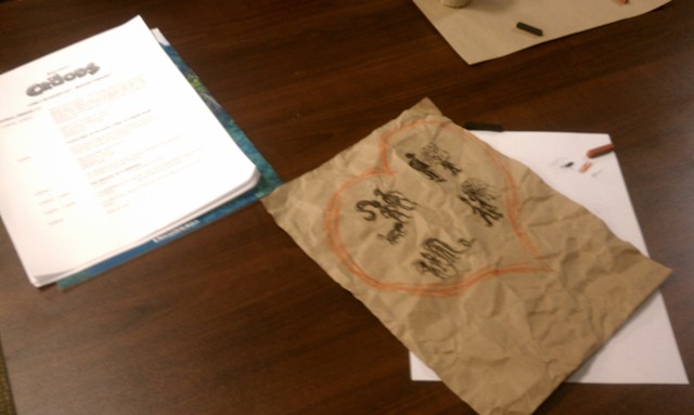 Take a brown paper bag from the grocery store. Use the inside of the bag (without the writing on it) and cut an 8.5 x 11 sheet out of it. Crumple the piece of paper up and then flatten it out, mimicking the texture of a cave wall. Then use a black crayon or a piece of conte crayon, a thinner and harder version of a pastel, to etch out your faux cave drawing. The trick is to exaggerate each family member’s most defining characteristics in order to make each more than a definition-less blob. I made my sister’s trademark ponytail almost comically large while Margaret made sure Eep’s signature wedge hairdo was readily identifiable.