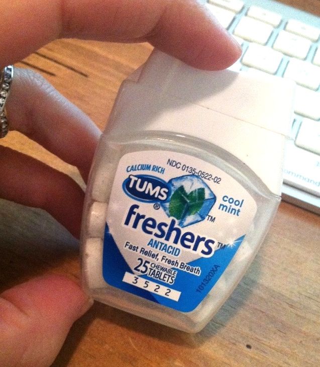 I never thought I’d be the girl who walked around with antacids in her purse… but here we are. I’m in my 9th month of pregnancy and food just isn’t playing nice with the rest of my body anymore. I caved while at Target a few days ago. Bought a big bottle of Tums for my house and then bought this mini-container for my purse. I have to tell you – I’m seeing results.